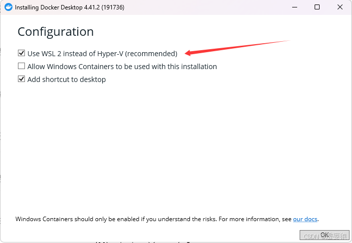 注意:下载后安装,全部默认即可。(如果 WSL 2 忘记勾选,可以在 Docker Desktop 里设置勾选)