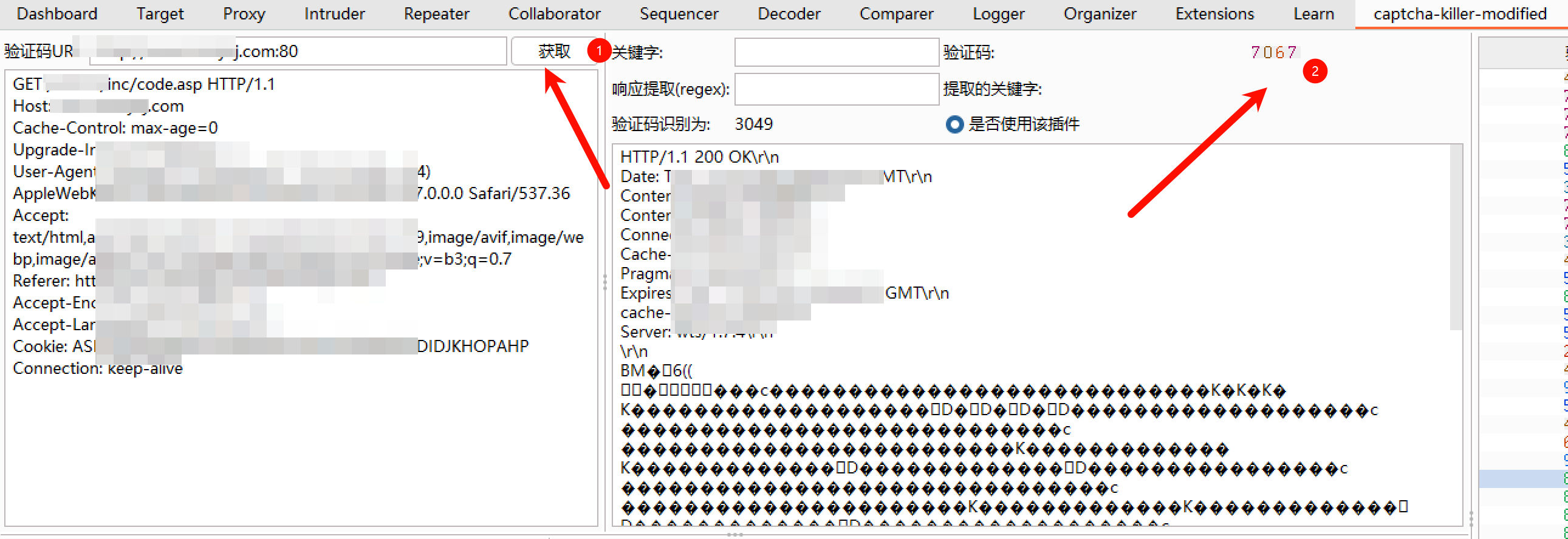 2.使用burp抓包该链接,然后右键-鼠标右键,将这个包发送到captcha-killer模组里,点击获取,查看到能识别出验证码就成功了。