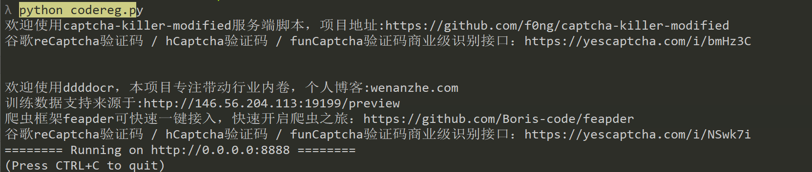 再使用python3 codereg.py开启验证码识别模块,前提安装ddddocr