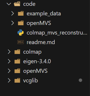 其中code目录为重建代码目录,其他为辅助的下载的文件。现在就需要将openMVS/openMVS_build/bin 下的全部二进制文件放入 code/openMVS 文件夹中。