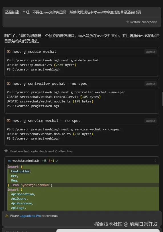 在原本的user上写,比较乱,让cursor重新创建一个目录,按照nest的命令创建的代码目录和规范去创建