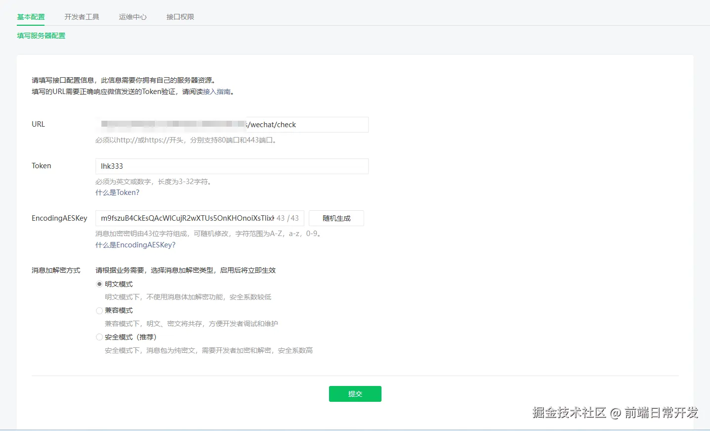首先,登录微信公众号平台,找到开发者设置,在这里填写对应的服务器信息,先可以本地调试,这里的url要后端去编写一个接口去响应,token要跟环境变量一致才会校验成功