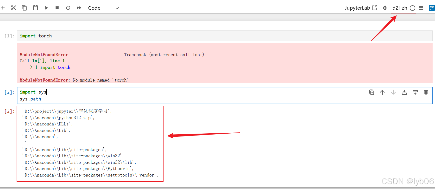 重新启动 jupyter,此时可以看到,成功导入了 torch ,并且包的搜索路径也变为了虚拟环境的路径。