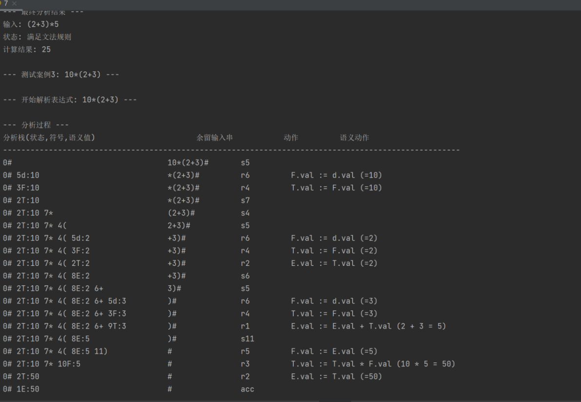 Token 和 StackItem 类:Token 用于词法分析器的输出,type 表示词法单元的类型(如 d, +, *),value 用于存储 d 类型数字的实际值(整数)。StackItem 是解析栈中每个元素的结构,除了LR解析必需的 state 和 symbol,还增加了 semantic_value 来存储和传递符号的属性值。TERMINALS, NON_TERMINALS: 定义了文法中的终结符和非终结符集合。GRAMMAR_RULES:一个字典,键是规则的索引(从0开始),值是一个元组 (左部符号, 右部长度)。这个结构在归约时非常有用,可以根据规则索引快速获取左部符号和需要从栈中弹出的元素数量。ACTION 和 GOTO 表:直接将实验指导书图2中的LR分析表硬编码为Python字典。这种嵌套字典的结构方便通过 ACTION[state][terminal] 和 GOTO[state][non_terminal] 进行查找。每个 ACTION 表项是一个元组 (动作类型, 目标)。动作类型可以是 's' (移进), 'r' (归约), 'acc' (接受), 'err' (错误)。目标对于移进是新状态,对于归约是规则索引。SEMANTIC_ACTIONS:这是语义计算的核心。一个字典,键是 GRAMMAR_RULES 中的规则索引,值是一个匿名函数 lambda vals: ...。每个 lambda 函数接收一个列表 vals,其中包含了被归约的右部符号的语义值(按从左到右的顺序)。例如,E -> E + T 对应的 lambda vals: vals[0] + vals[2] 表示左部 E 的值是右部第一个 E 的值加上 T 的值。+ 符号本身在这里没有语义值,所以 vals[1] 被忽略。F -> d 对应的 lambda vals: vals[0] 表示 F 的值就是 d 的词法值。S -> E 的语义动作特殊处理,因为它通常是输出最终结果,而不是产生一个用于后续计算的值。lexer(input_string) 函数:一个简单的词法分析器,负责将输入字符串转换为 Token 列表。能够识别数字(多个数字字符组成的整数)和运算符/括号。数字被识别为 Token('d', int_value),运算符和括号则为 Token(char, None)。跳过空格。parse(input_string) 主函数:初始化:调用 lexer 获取Token流,并在末尾添加 '#' 结束符。parser_stack 初始化为 [StackItem(0, '#', None)],代表初始状态0和栈底符号#。input_buffer 是一个双端队列,方便高效地弹出和查看下一个Token。steps 列表用于记录整个解析过程,方便后续打印。主循环:循环直到 ACCEPT 或 ERROR。获取当前栈顶状态 (current_state) 和当前输入Token (current_token_type, current_token_value)。根据 current_state 和 current_token_type 查 ACTION 表。SHIFT 操作:将当前输入Token从 input_buffer 弹出。创建一个新的 StackItem (包含目标状态、Token类型和Token值),压入 parser_stack。REDUCE 操作:根据规则的右部长度 rhs_length,从 parser_stack 弹出相应数量的 StackItem。注意 insert(0, ...) 以保持弹出顺序与RHS符号的顺序一致。提取这些弹出项的 semantic_value,传入对应的 SEMANTIC_ACTIONS 函数,计算出左部符号的 lhs_semantic_value。根据新的栈顶状态和左部符号,查 GOTO 表得到 new_state。创建一个新的 StackItem (包含 new_state, 左部符号, lhs_semantic_value),压入 parser_stack。关键的语义动作描述生成: 这一部分是为了在打印分析过程时,清晰展示每一步语义动作的计算逻辑和结果。ACCEPT 操作:解析成功。打印完整的分析过程表,并输出最终的计算结果。ERROR 操作:解析失败。打印分析过程表,并指明出错的状态和遇到的符号。打印输出: 函数内部负责格式化打印分析栈、余留输入串、动作和语义动作,以及最终的分析结果或错误信息。