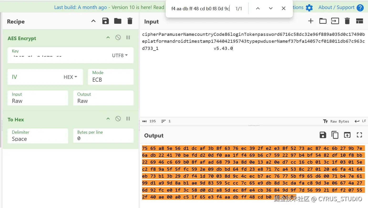 [AES] 原文: cipherParamuserNamecountryCode86loginTokenpassword6716c*******************************************************42195743typepwduserNamef37bfa14057cf018011db67c963cd733_1********9b381828fb63v5.43.0