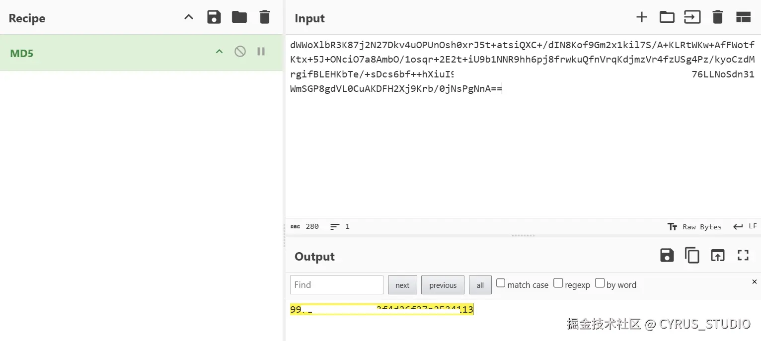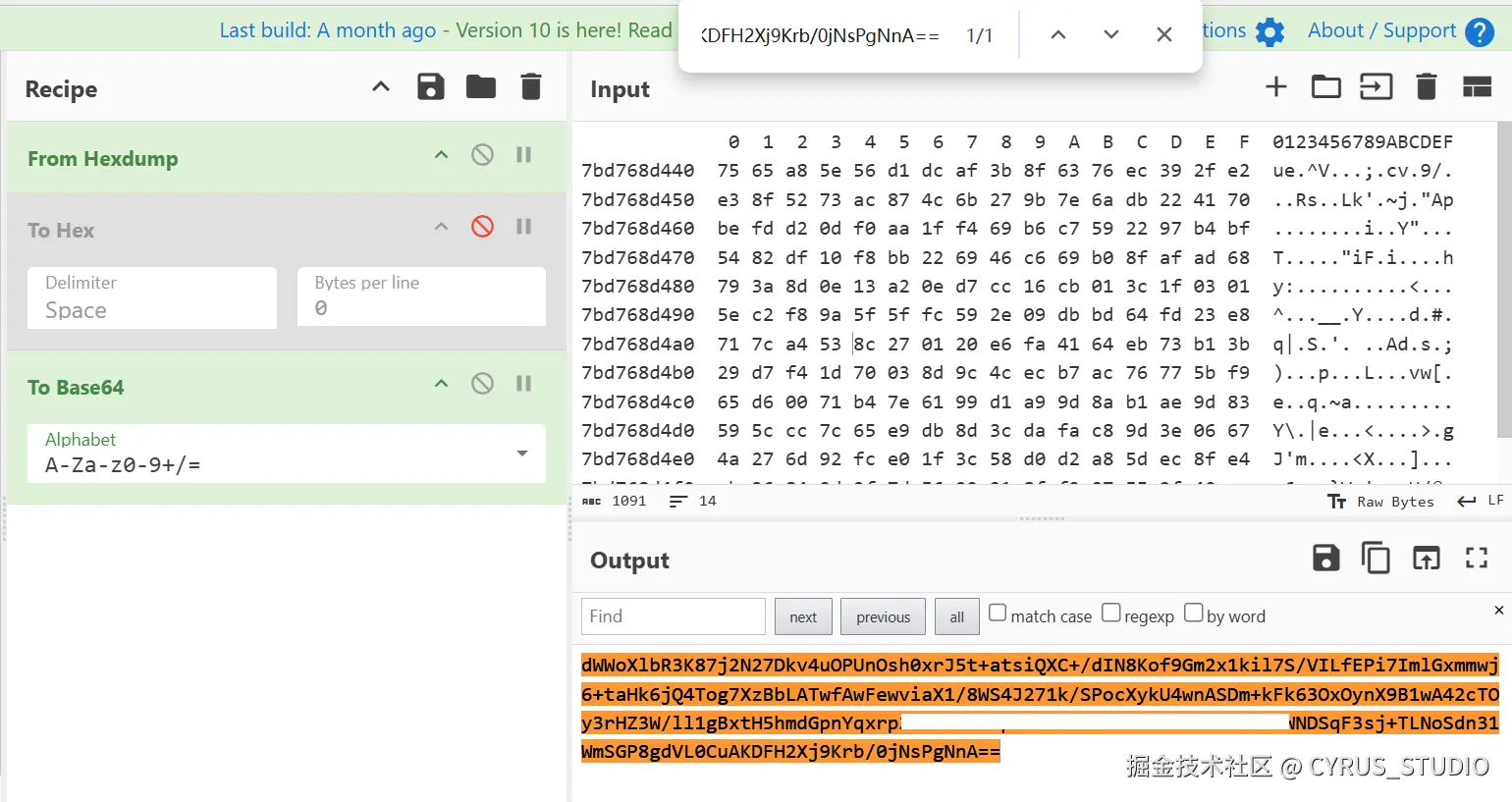 把 hexdump 复制到 CyberChef 使用标准 base64 编码结果 和 NCall.IL 返回值是一样的,也就是说 b64_encode 就是一个标准的 base64 编码方法。