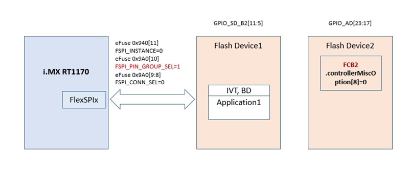 比如下图我们设了 efuse FSPI_PIN_GROUP_SEL=1 从 Flash Device2 去启动,当 ROM 从 Flash Device2 里拿到 FCB2 之后,发现 FCB2 里的 pin 配置指向得却是 Flash Device1 的引脚连接,那么接下来 ROM 加载启动得便是 Flash Device1 里的 Application1。这样的应用场景需要挂两颗 flash,看起来稍显多余。