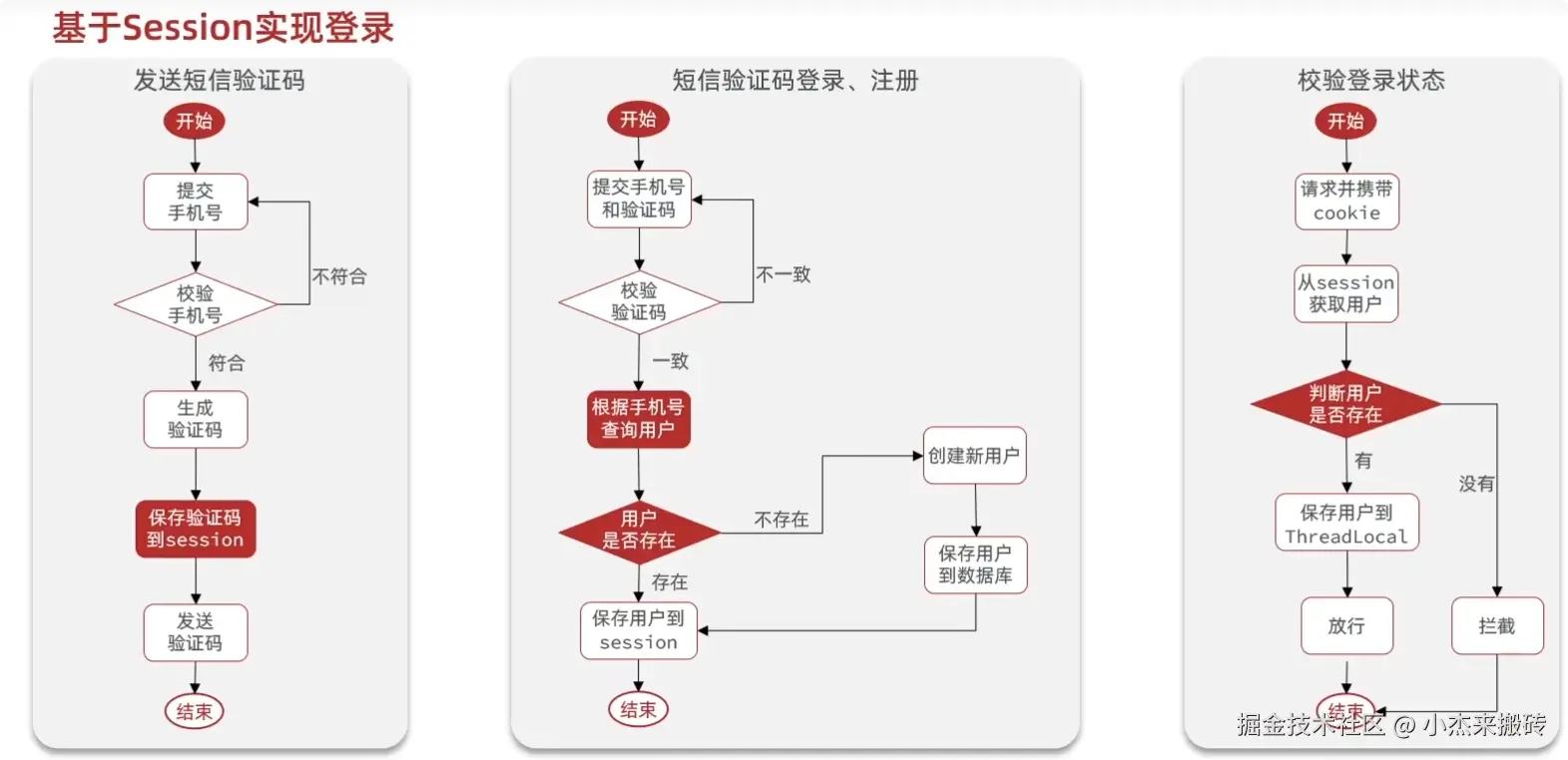 - 保存验证码到 Session 中:将验证码以手机号为 key 存入 Session(服务端内存)。