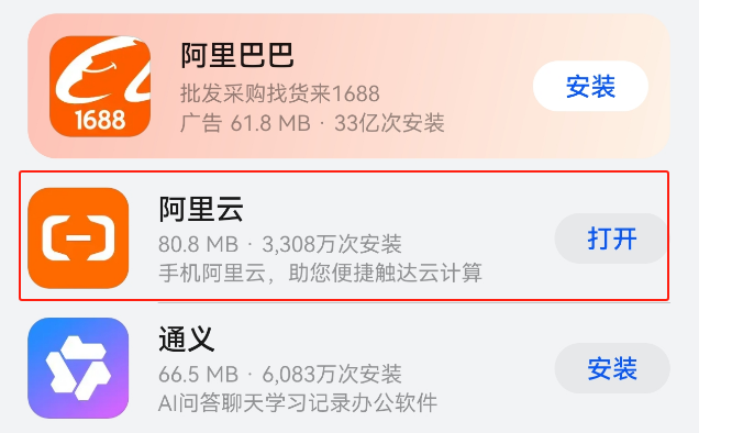 - 打开华为手机「应用市场」,搜索栏输入 "阿里云",点击「安装」按钮完成部署。