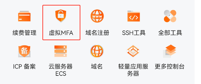 - 启动阿里云 APP,点击底部「我的」→ 进入「安全中心」→ 找到「虚拟 MFA」模块并启用。
