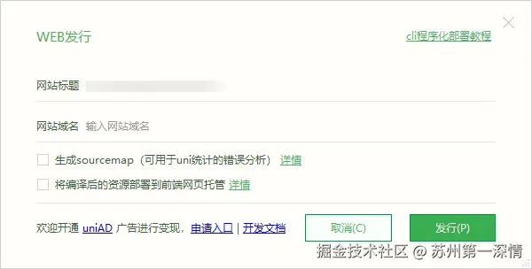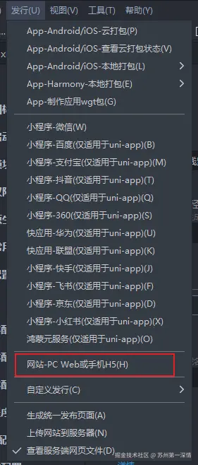 配置完点击 发行 ,点击 网站-PC Web或手机H5(H),如下图所示: