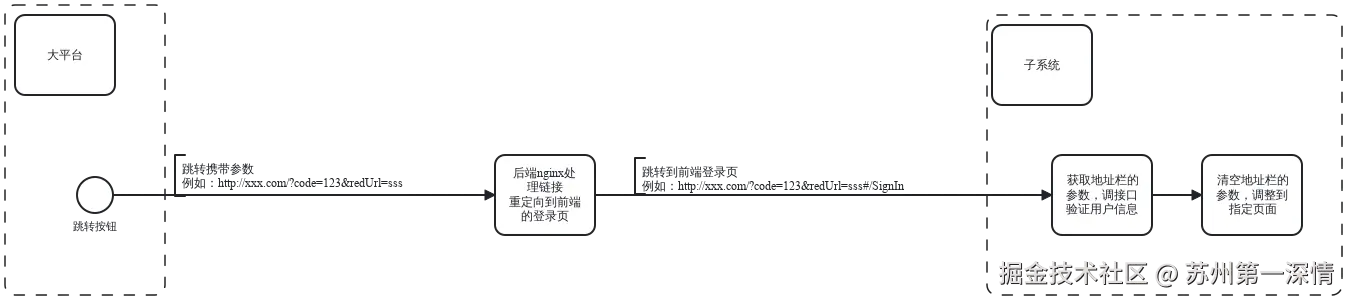 实现思路: 第三方大平台那边点击按钮跳转到子平台, url中?拼接code,或者token等其他字段,然后子平台这边调接口携带这个入参, 接口返回的就是处理过后的用户信息, 具体怎么处理的这个是后端写的,咱前端能拿到用户信息就行, 拿到了就可以根据用户权限跳转到对应的路由页面了。 如果第三方大平台和子系统共用一个后端接口的话, 跳转验证用户权限的时候不用再重复调接口了,直接跳转就行. 图文版如下图所示: