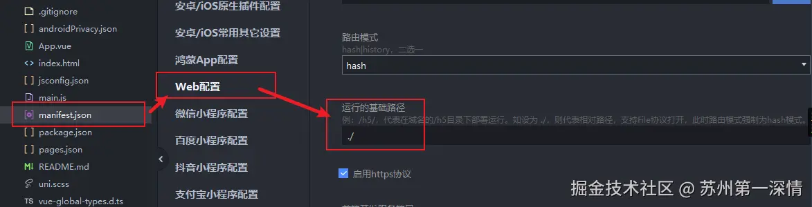 找到manifest.json文件,点击Web配置,重点看这个运行的基础路径,他是打包部署后显示页面的关键,配置错了访问线上地址会出现页面空白的问题。如下图所示: