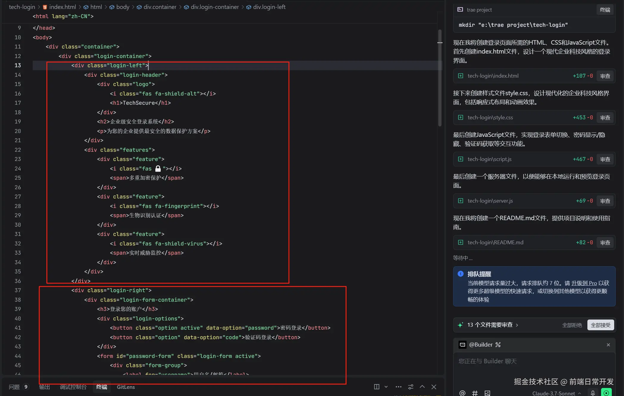 首先看看Trae的登录页面DOM的代码,采用的是居中的左右布局,右边是登录表单,左边是登录背景