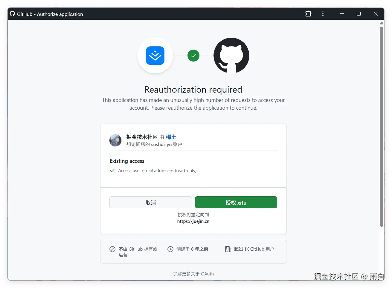 弹出这个窗口的目的是进行第三方授权,让 Github 将你的信息的获取权限授予给掘金。此时授权的第三方是掘金,为什么呢?你在 Gitbhub 的信息权限本是你和 Github 约定的。