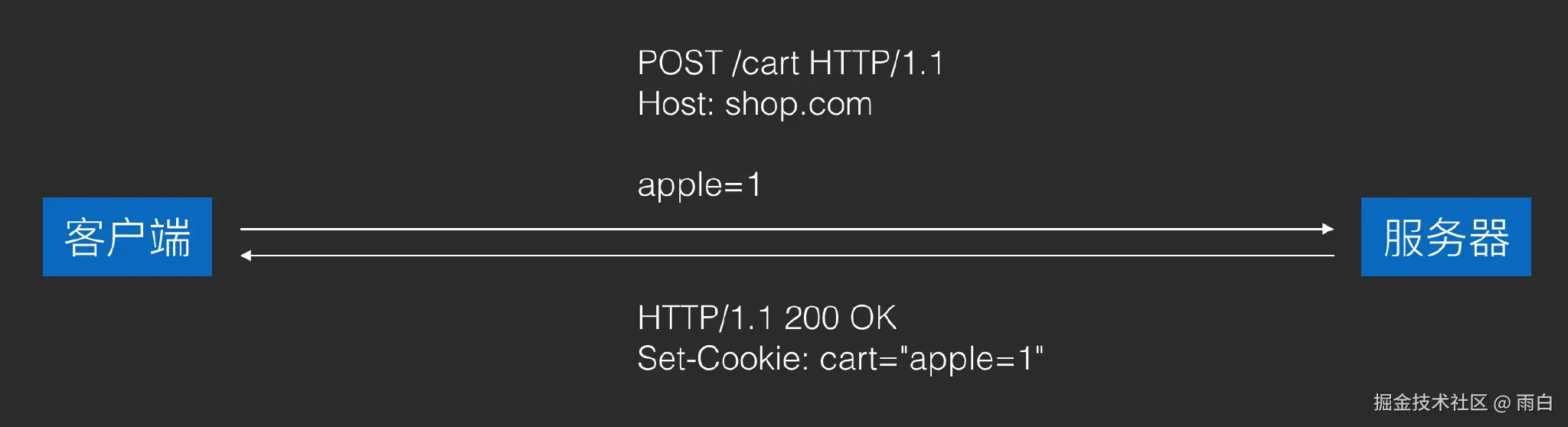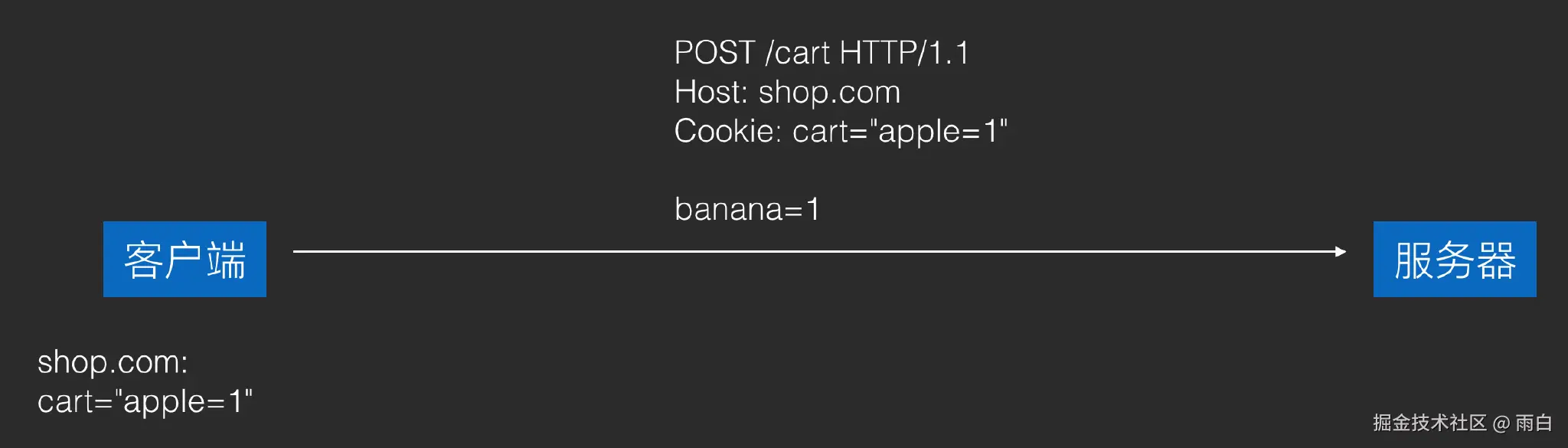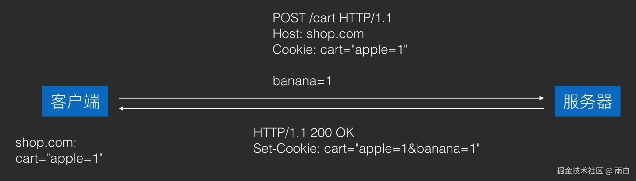 客户端收到响应结果后,发现当前要存储 cart 这个 key 已经存在,就会覆盖它的值,更新为 "apple=1&banana=1"。