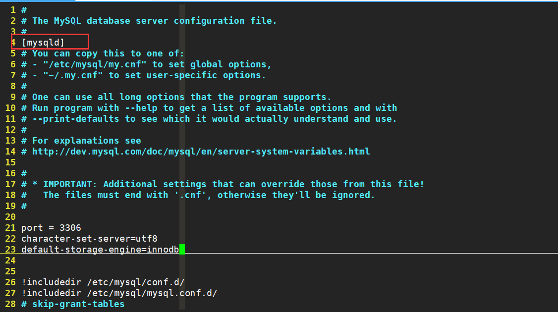 重新回到刚刚在/etc目录下找到mysql文件夹进入my.cnf文件 文件开头配上[mysqld]