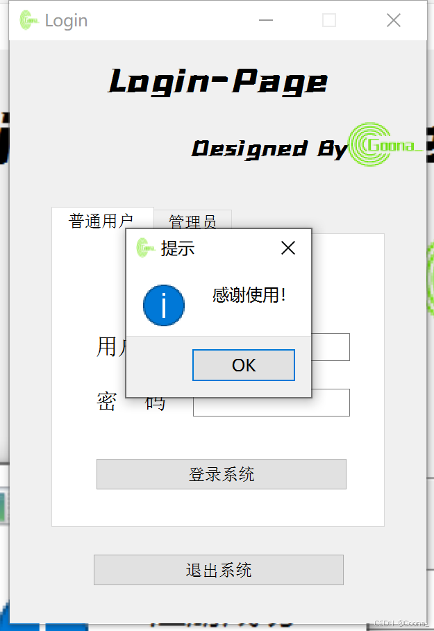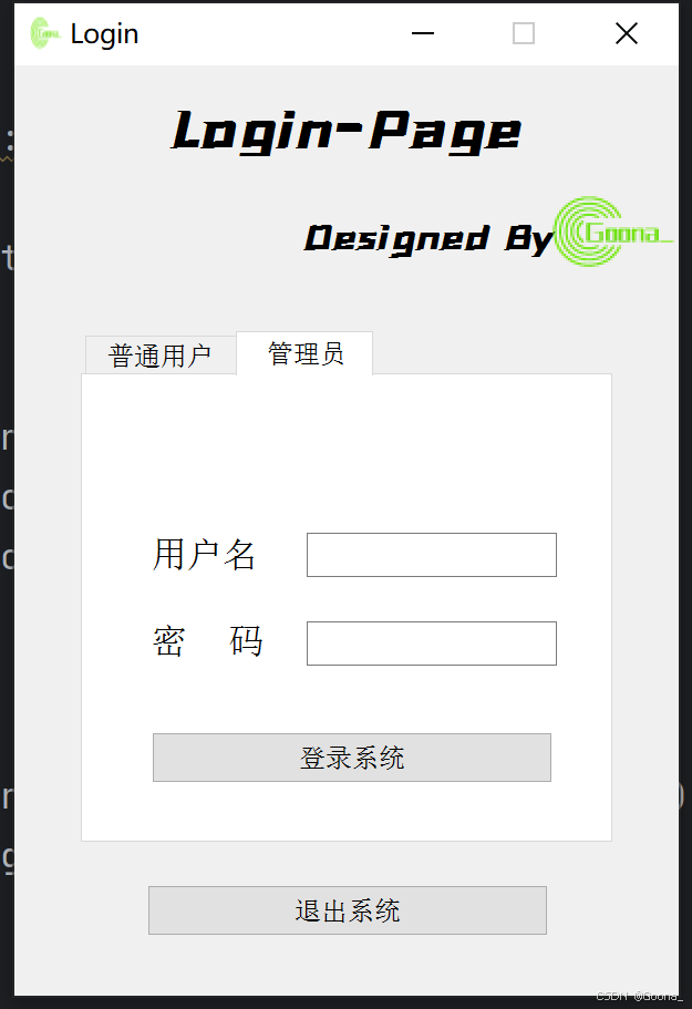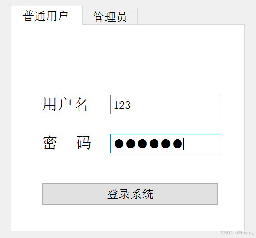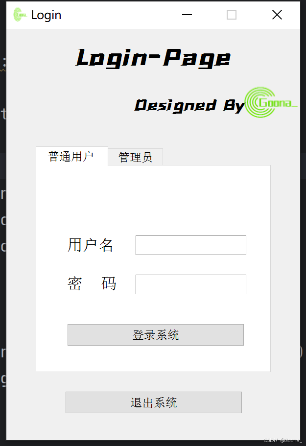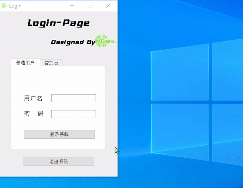 登录界面含有两个标签页,分别是"普通用户"和"管理员"页面。这两个页面的整体布局和控件一致,均需输入用户名和密码才可以正常登录,而且在最下方均含有"退出系统"的按钮,可以随时直接退出系统。