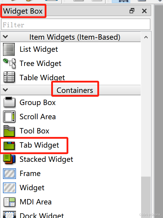 注意:两(多)个标签页 的构造需要用到Tab Widget控件,其位置如下,找到后直接拖入对应Form即可: