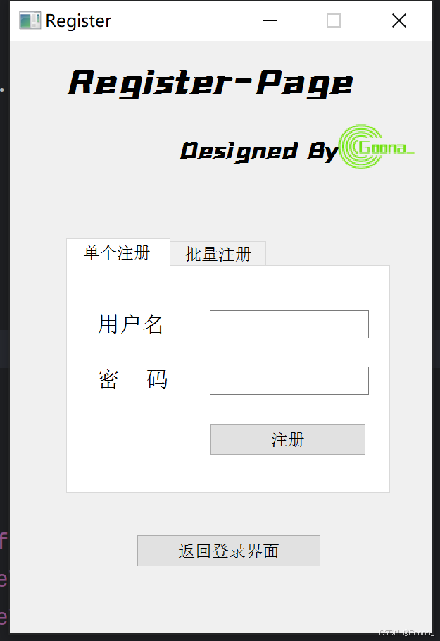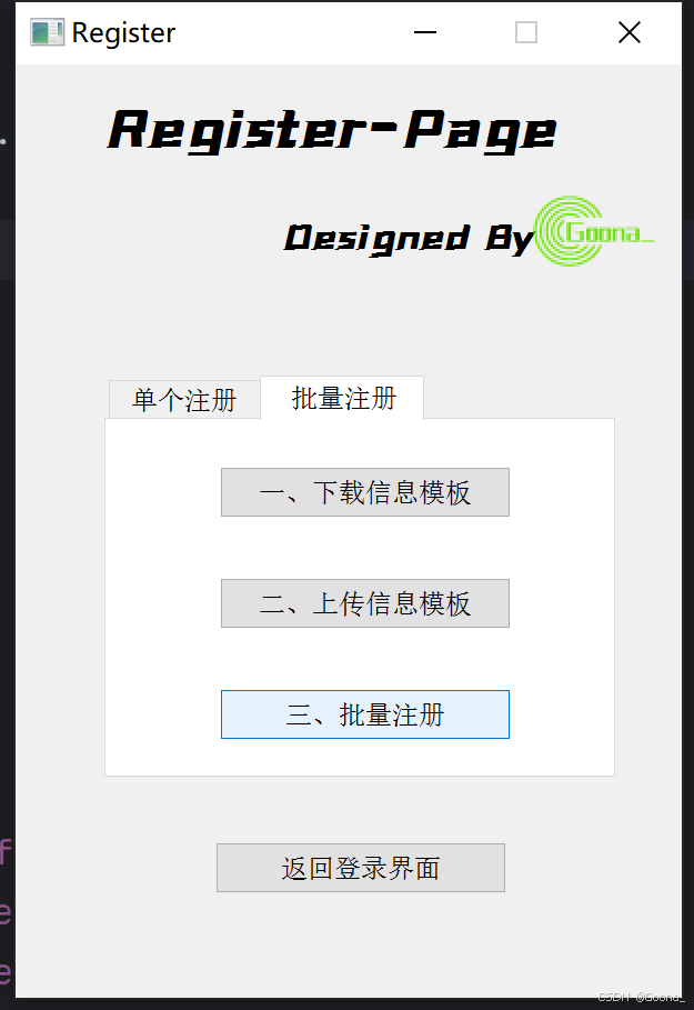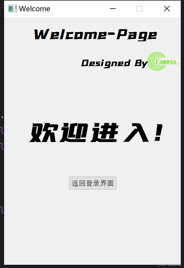 说明:这里将三个类:loginpage、welcompage、registerpage均放置在同一.py中,实际上,最优解应该将其分别放置在三个.py中,便于后期在此基础之上进行继续开发。