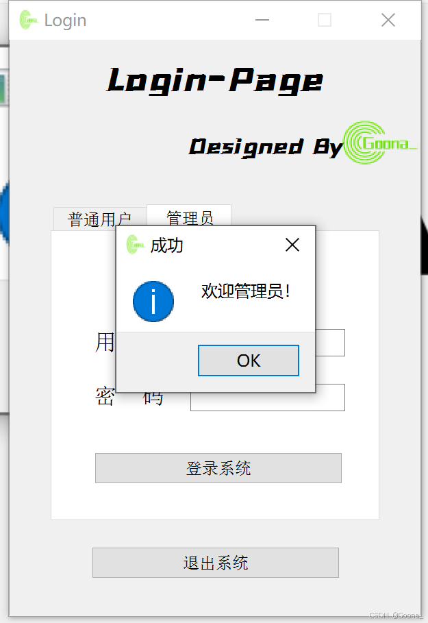 将用户输入的账号(lineedit_4)和密码(lineedit_3)与gl_name和gl_password分别对比核验,只有都相等时,才可以进入管理页面,否则给出对应提示。
