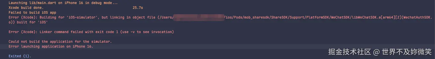 错误表示,微信的SDK无法链接上。ShareSDK使用的xcframework,里面包含了arm64和x86_64指令集编译后的库。