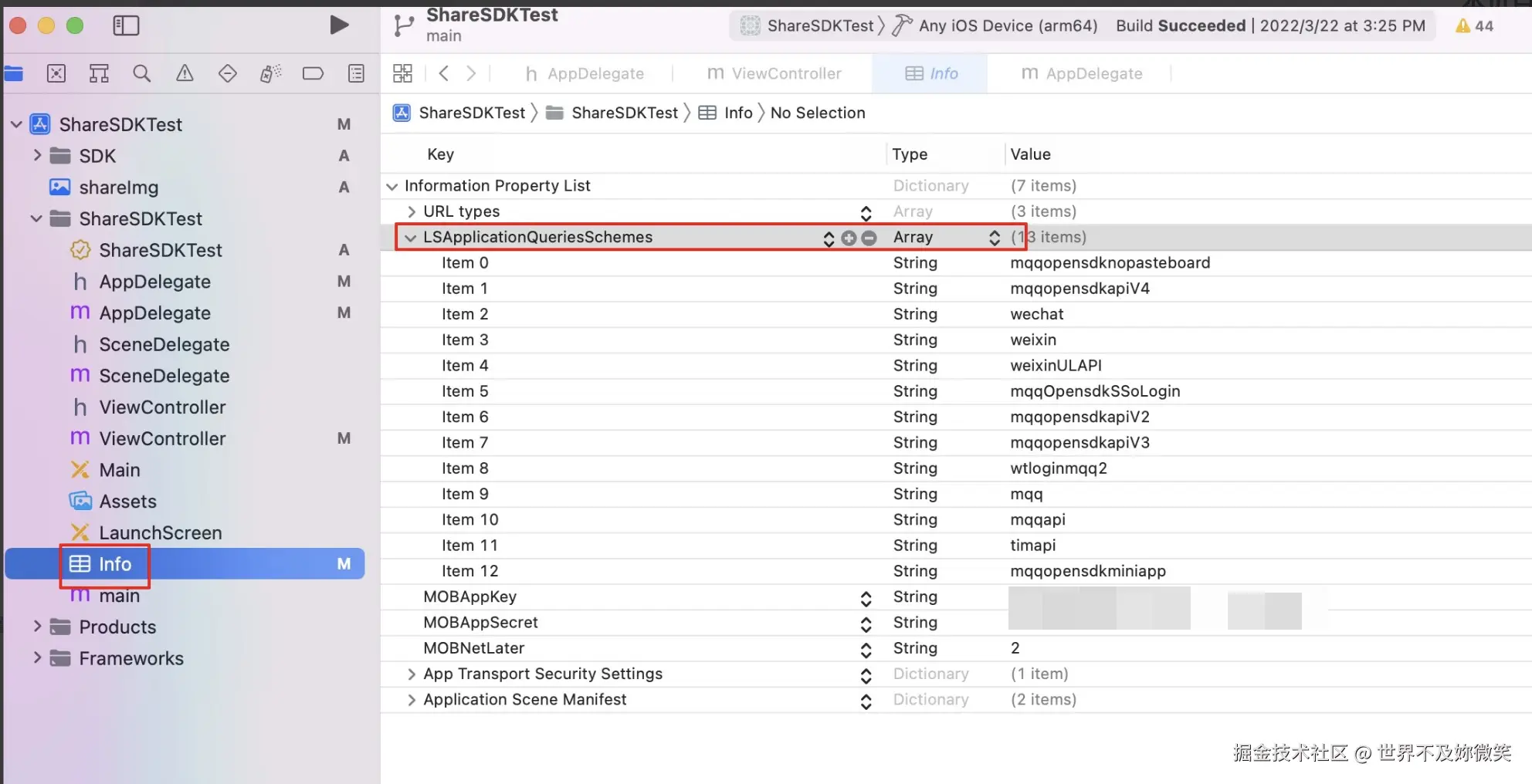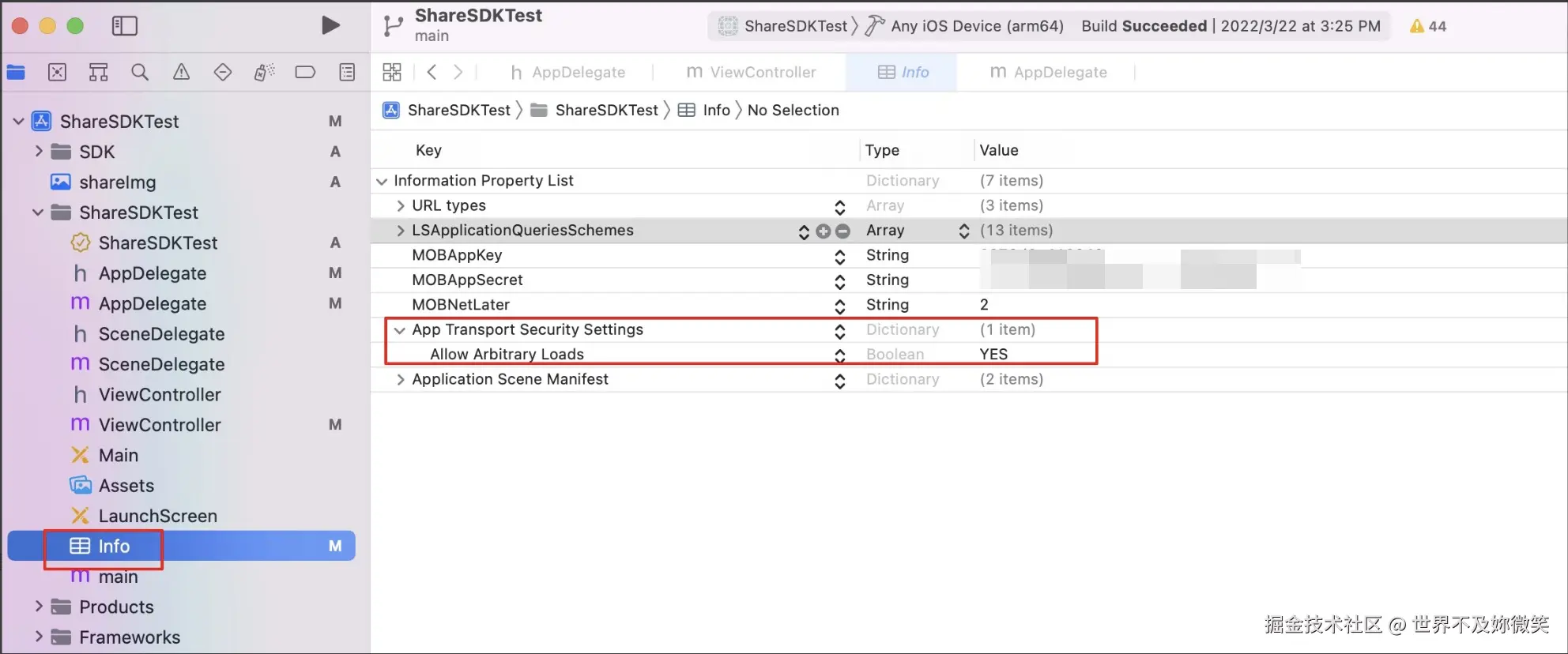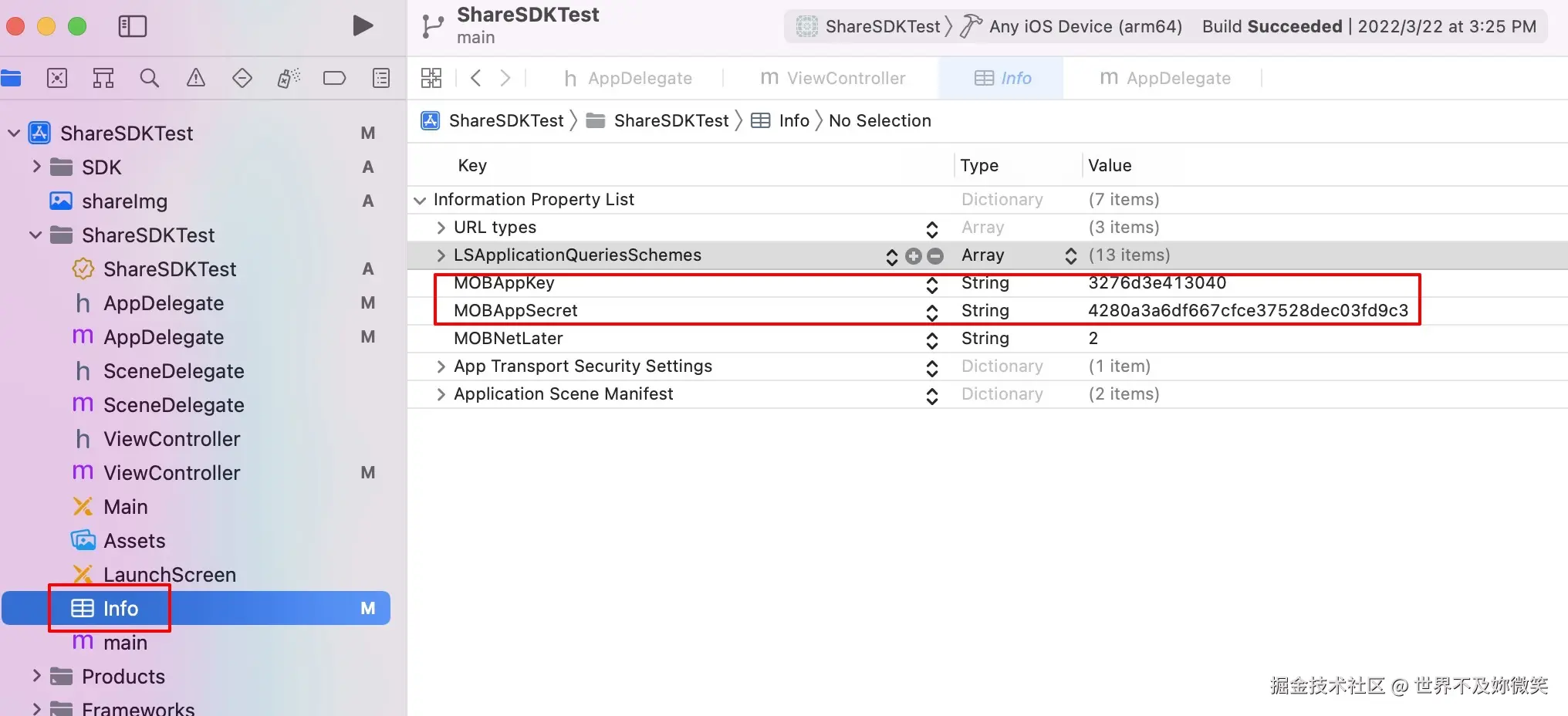 在项目工程的Info.plist中如图增加MOBAppKey 和 MOBAppSecret两个字段