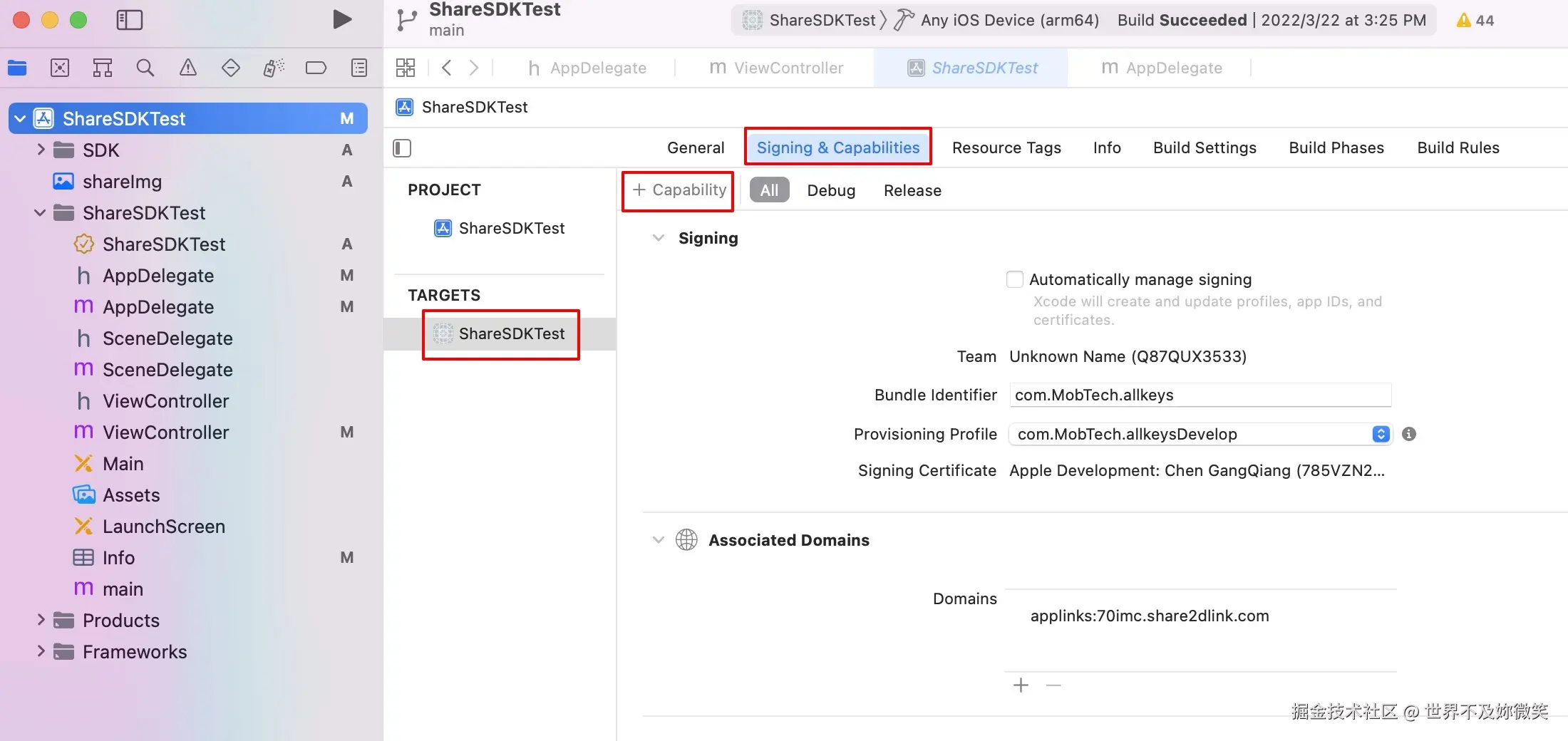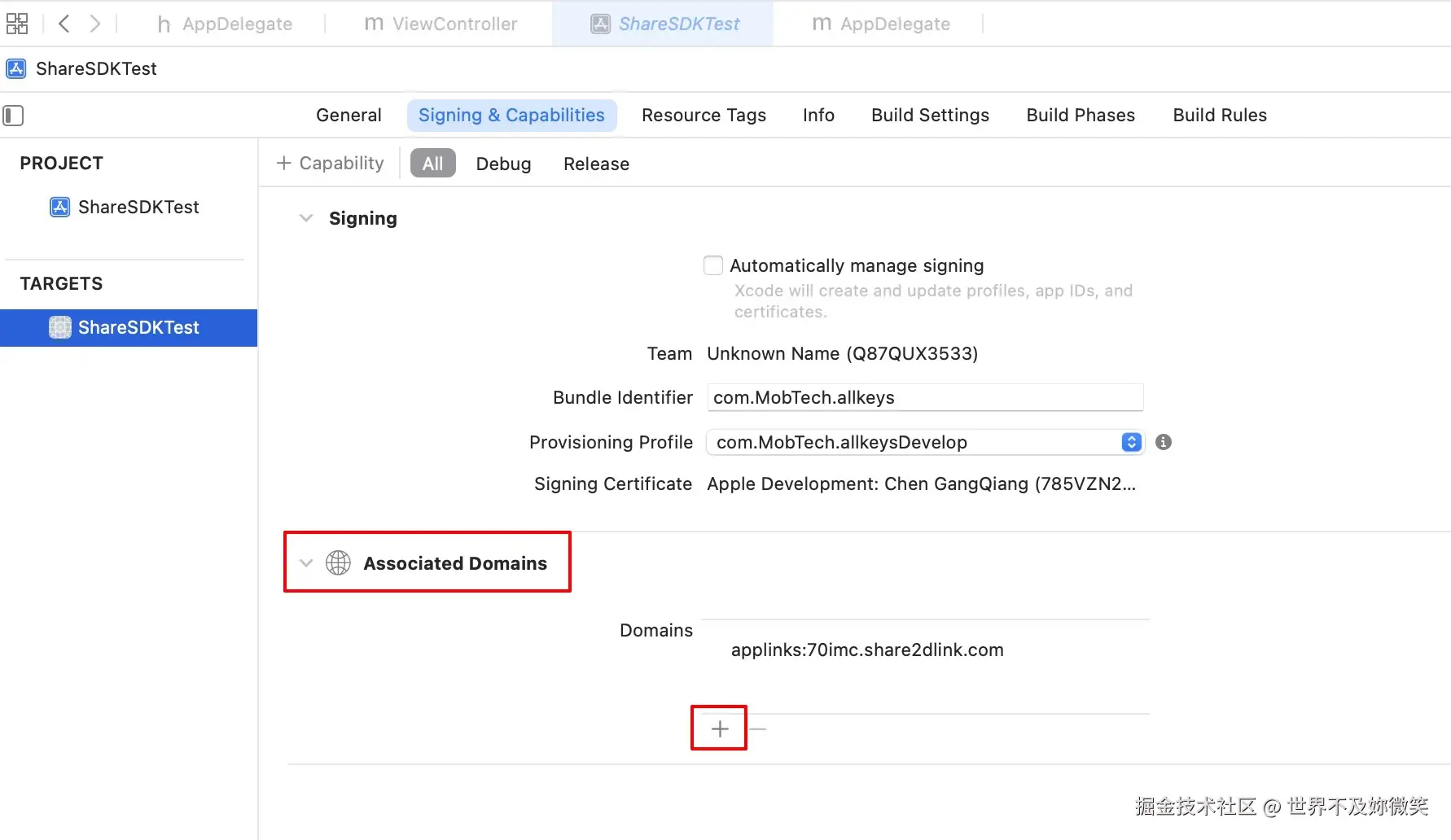 填写上 Universal Link 配置,填写的格式是 applinks:xxxx