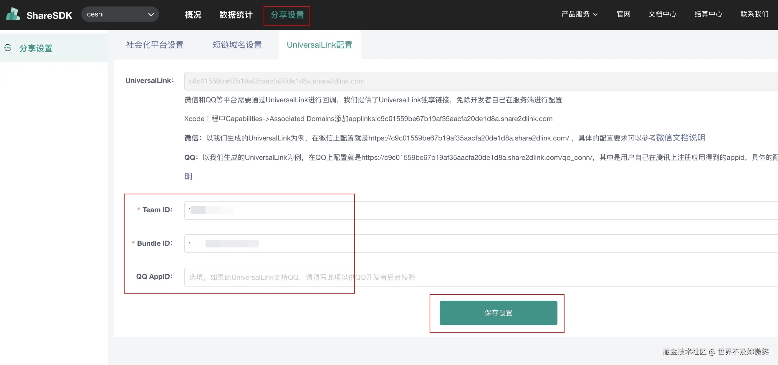 注意: Team id,Bundle id 这些必须要填写的和自己项目里使用的证书的 Team id 和 Bundle id 一致,QQ AppID 是填写 qq 初始化的 appid,如果需要 QQ 平台,那么需要填写上,把信息都填写之后保存了才可以使用我们生成的 Univesal link