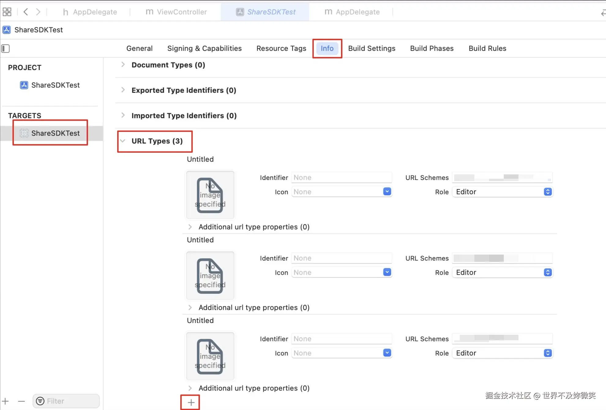 打开项目的 Info 选项,然后选择 URL Types,添加对应平台的 URL Scheme 配置,如下图: