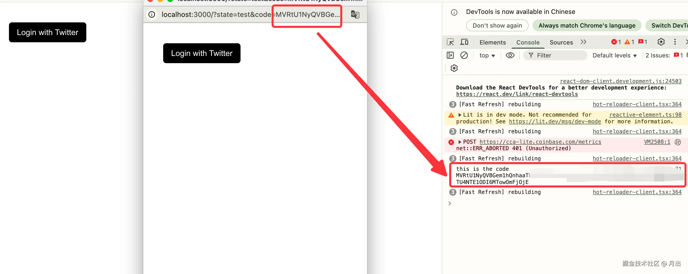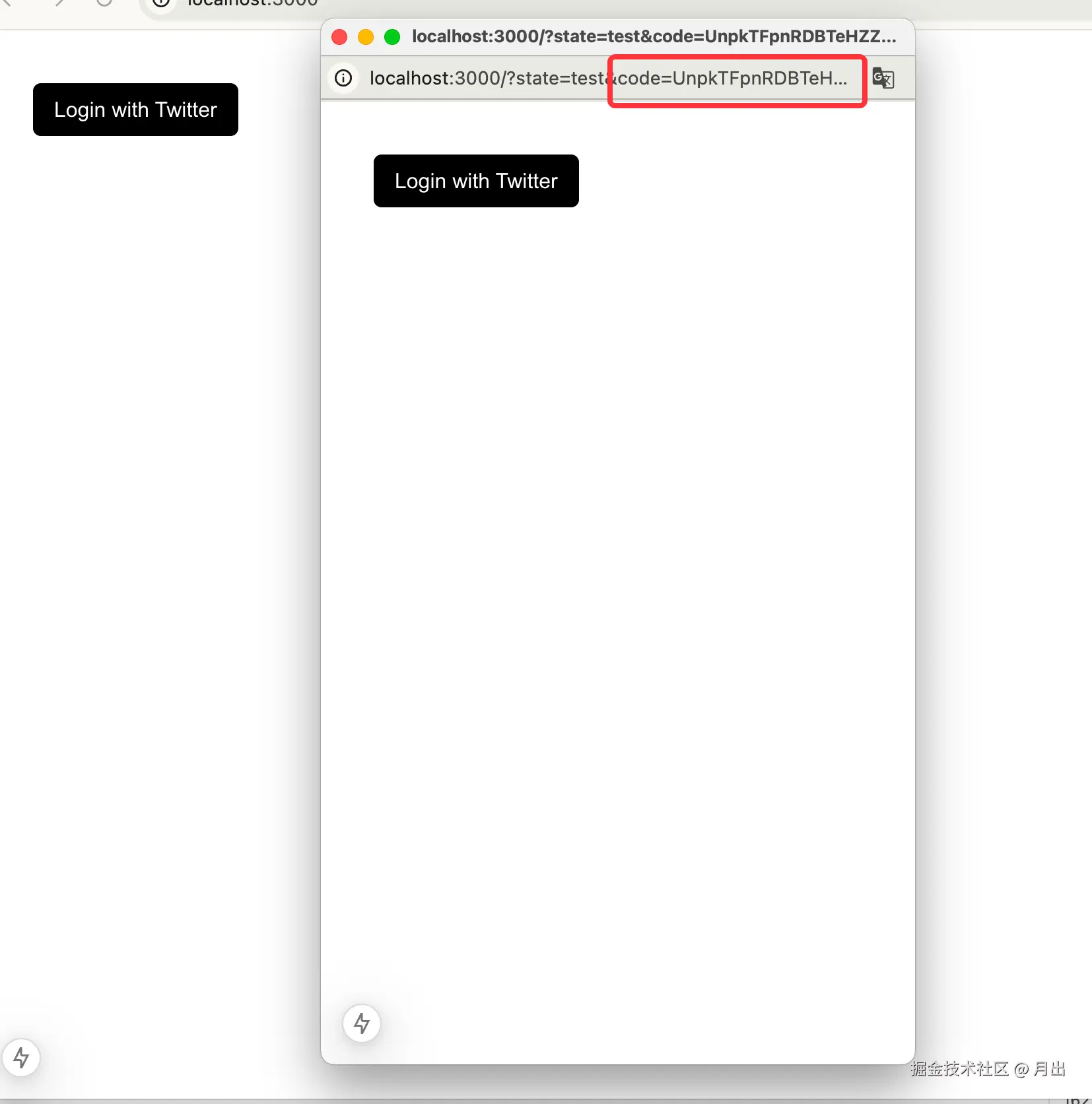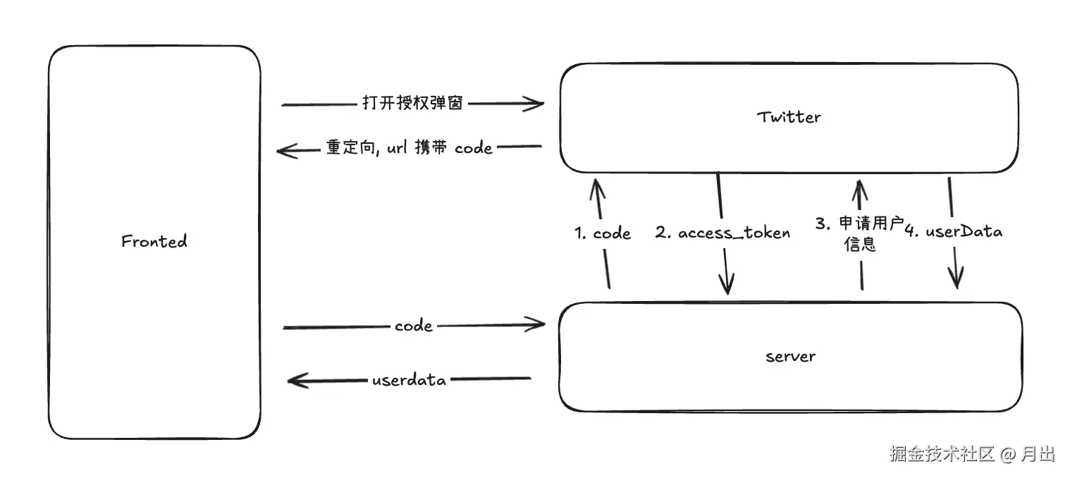 - 前端"发起授权",跳转至 Twitter 授权页面,授权通过后重定向回前端页面,并在 URL 中携带 授权码(code) 。