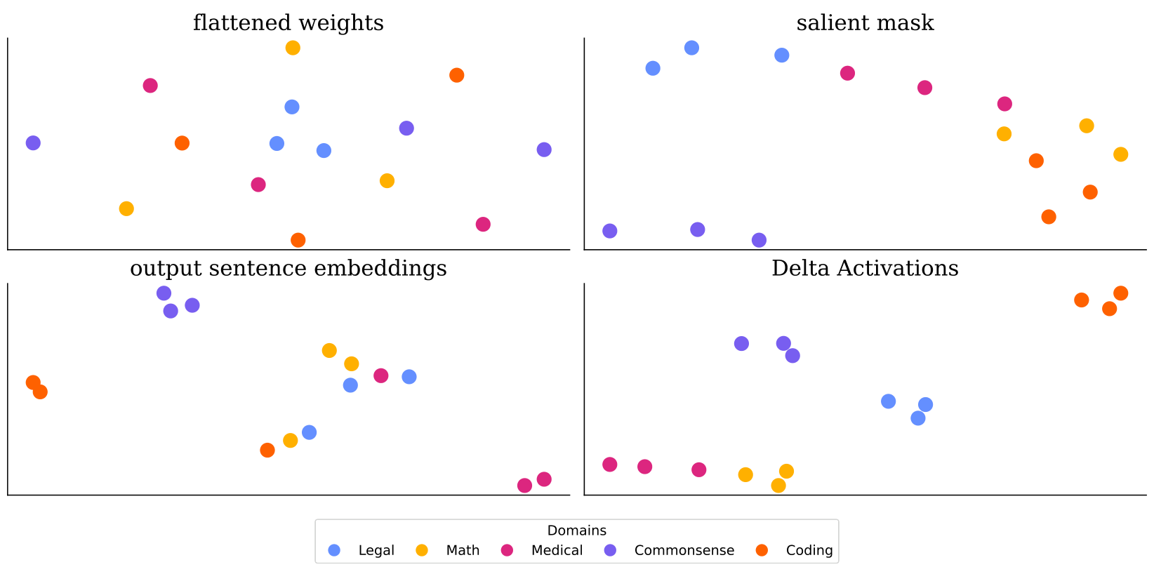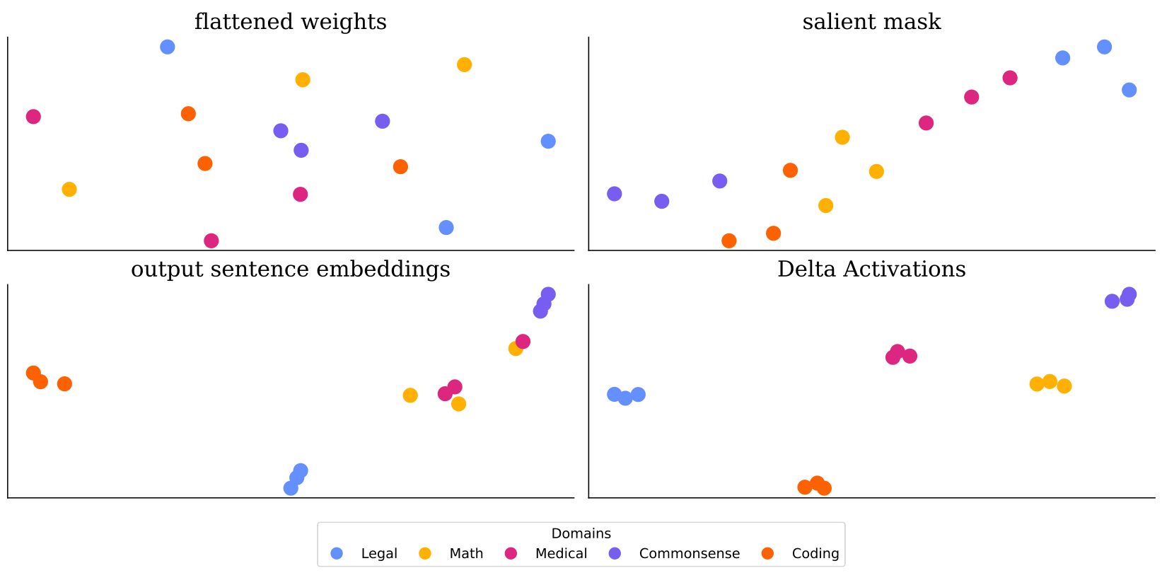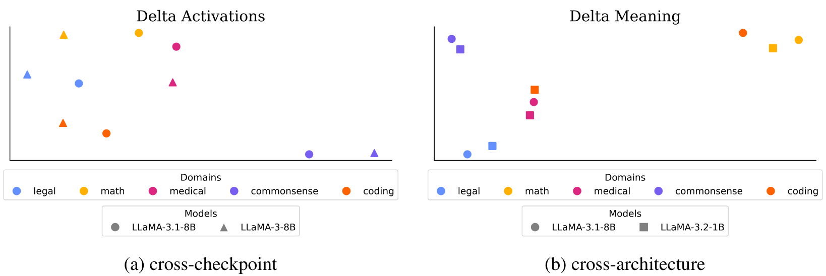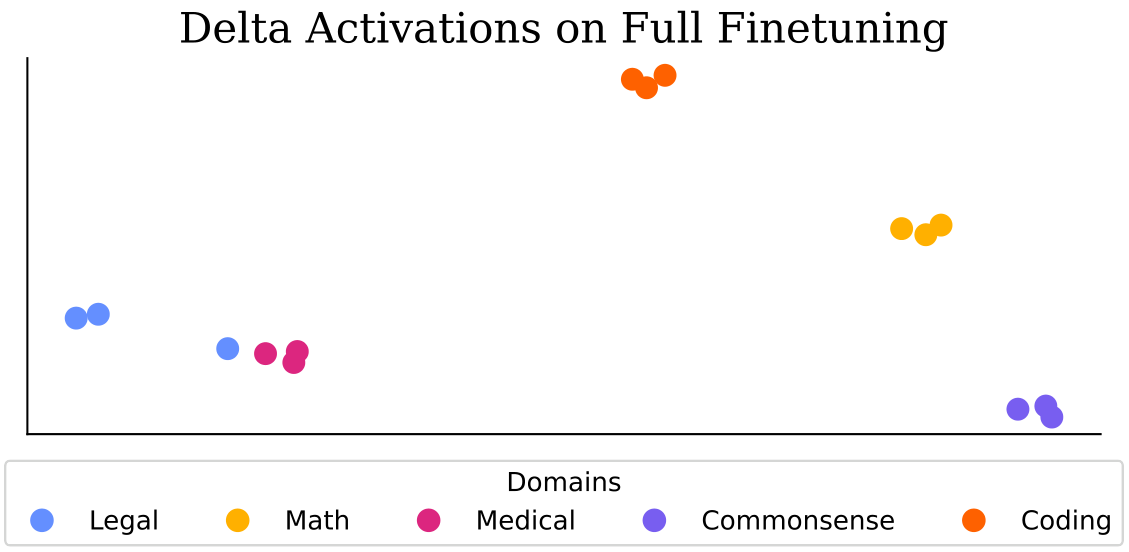 Delta 激活:Delta 激活提供了一种简单而有力的方式,通过测量相对于基础 LLM 的内部激活偏移来表征微调后的 LLMs。我们的实验表明,这种表征方式始终形成反映微调领域的不同簇,并具有反映多领域行为的加性属性。Delta 激活在不同微调设置下的稳定性显示了其在模型选择和模型中心合并用例中的可靠性。我们认为,Delta 激活可以作为导航日益扩展的微调模型领域的基石,促进更高效的模型发现和重用。