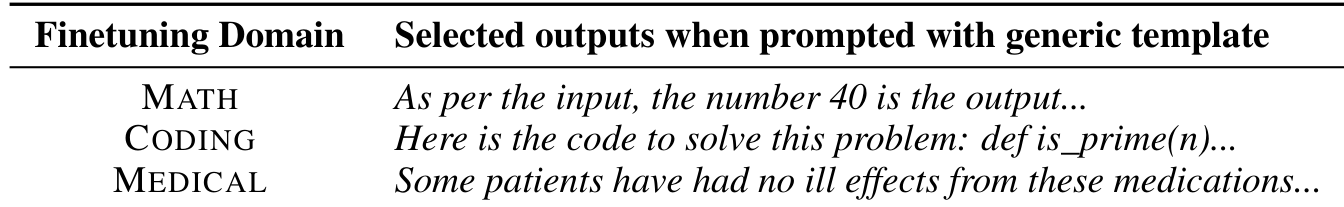 作者对 LLAMA-3.1-8B 在数学、编程和医疗三个领域进行微调,并使用通用模板提示模型。尽管大多数输出如预期那样重复且通用,但作者观察到微调模型偶尔会针对通用指令模板展示其特化行为。这一现象启发了 Delta Activations 方法的开发。