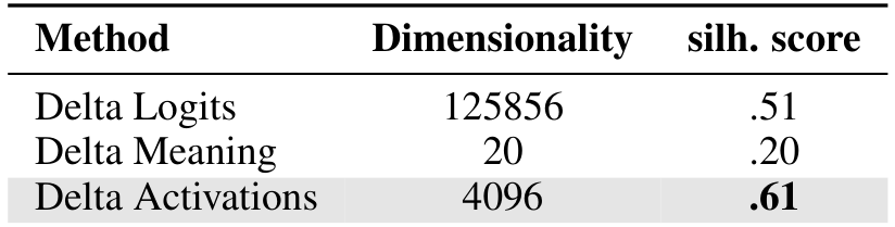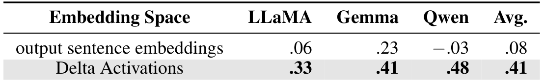 task, revealing structure in the model landscape. Delta Activations also