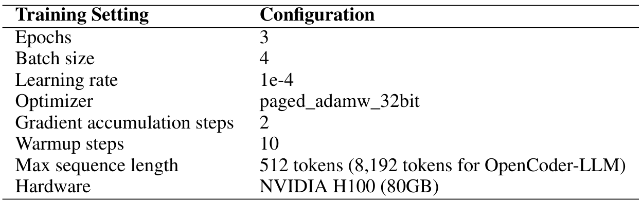 对于 LoRA,我们设置秩 r = 8 r = 8 r=8, Q = 16 Q = 16 Q=16,目标是查询、键、值和 MLP 投影(q-proj, k_proj, v_proj, up-proj, down_proj, gate_proj),不使用 dropout 且无偏置参数。