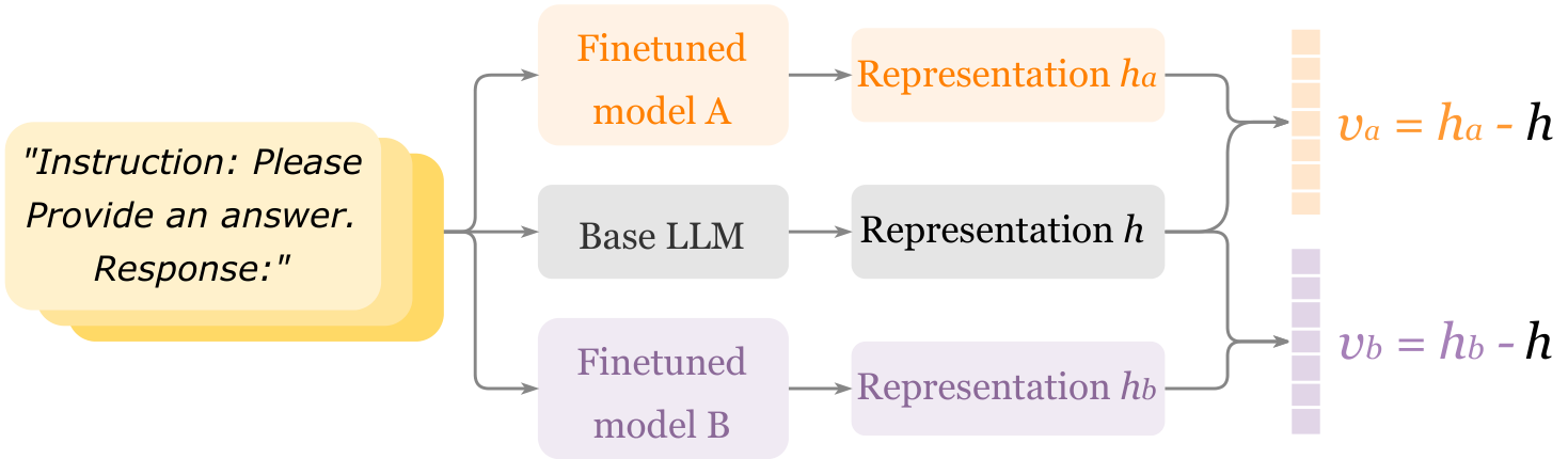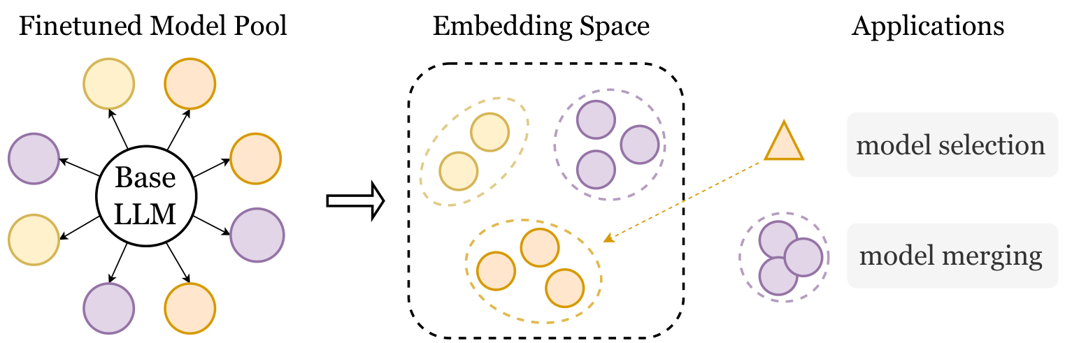 设 f b a s e f_{base} fbase 为一个预训练的大型语言模型, F = { f 1 , f 2 , . . . , f k } F = \{f_1, f_2, ..., f_k\} F={f1,f2,...,fk} 是一组从 f b a s e f_{base} fbase 通过后训练得到的微调模型。目标是为 F F F 中的每个模型 f f f 构建一个嵌入 V f ∈ R d V_f \in R^d Vf∈Rd,以反映该模型相对于 f b a s e f_{base} fbase 的特化和行为差异。