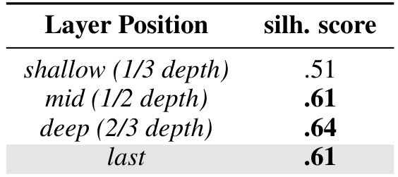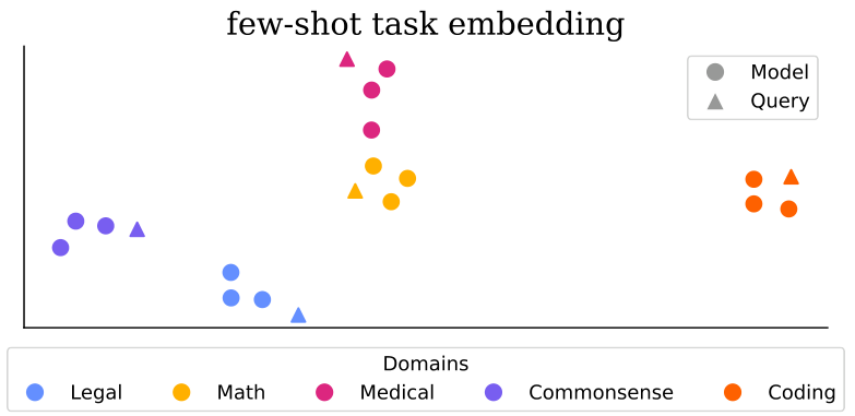 嵌入模型与任务:Iharco 等人 [23] 发现通过微调得到的任务向量可以合并以实现多任务学习。已有多种尝试使用适配器权重 [48, 60]、评估配置文件 [79] 或依赖训练数据的特性 [77] 来表征大型语言模型(LLMs),但这些方法依赖于可能无法获取的数据或未能反映内部行为。我们的工作通过从内部行为中提取嵌入,无需外部监督或评估,与之不同。