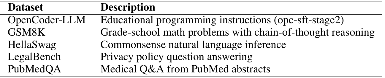 激活:近期研究揭示了 LLMs 隐藏激活中的结构,理解大量激活如何作为偏见引导 LLM 输出 [57, 10]。激活还在训练后压缩中起到核心作用:它们被用于计算权重显著性以进行剪枝 [12, 56, 71],并通过校准集减少量化误差 [13, 34, 76],这启发了我们使用 Delta 激活的探针数据集。此外,学习到的激活偏移已被用于跨模型编辑或转移行为 [36, 32, 39]。