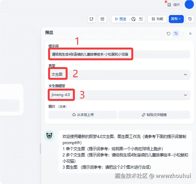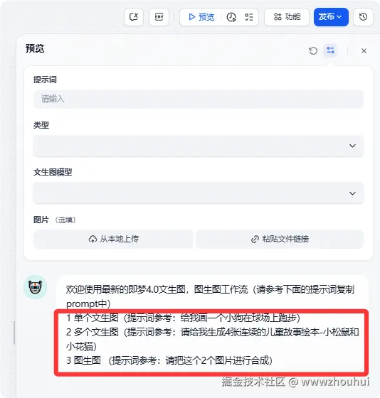 点工作流会有预览功能 提示词单个文生图、多个文生图、图生图提示词