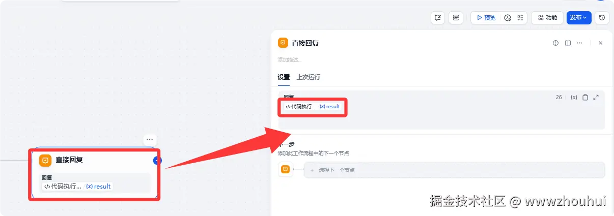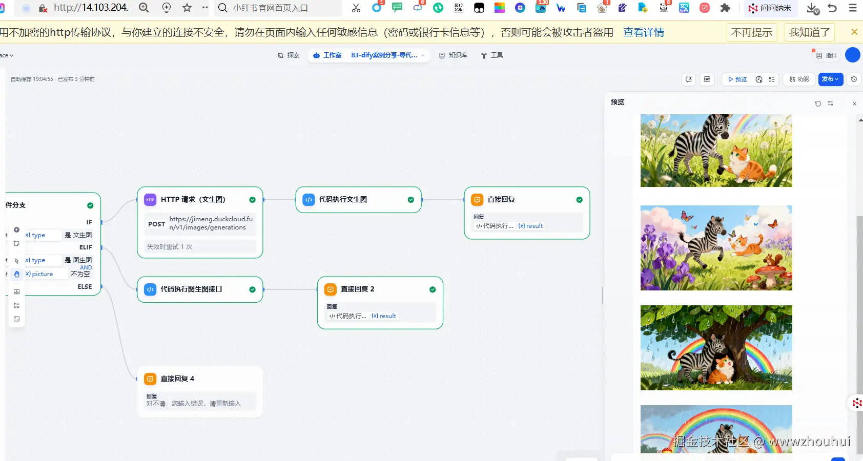 以上我们就完成了工作流的搭建,总体来说还是比较简单的。对比上期《dify案例分享-零代码用 Dify 使用梦 AI 3.0 多模态模型,免费生成影视级视频》要简单的多。