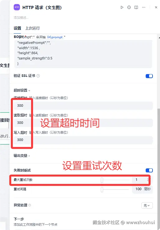 考虑到即梦4.0 执行比较慢,这里我们把dify http请求的超时时间改成300秒,重试次数变成1