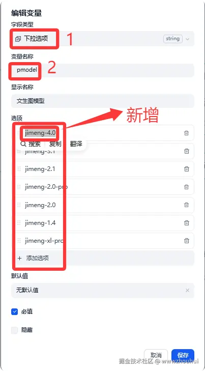pmodel 主要是让用户选择文生图模型使用,本次我们在上个工作流基础上增加了jimeng-4.0 选项