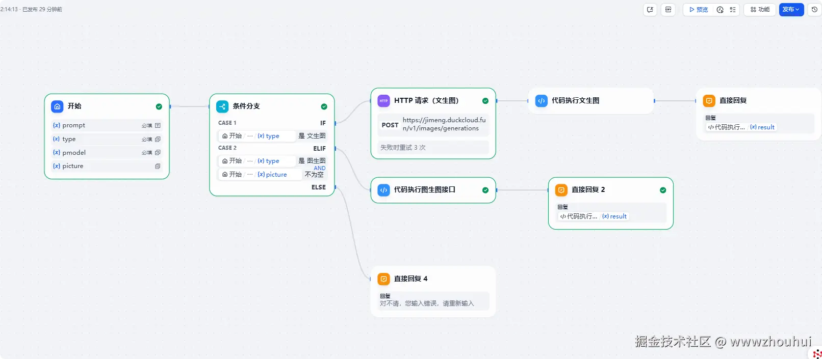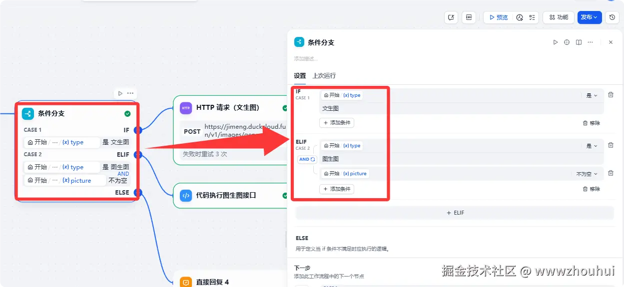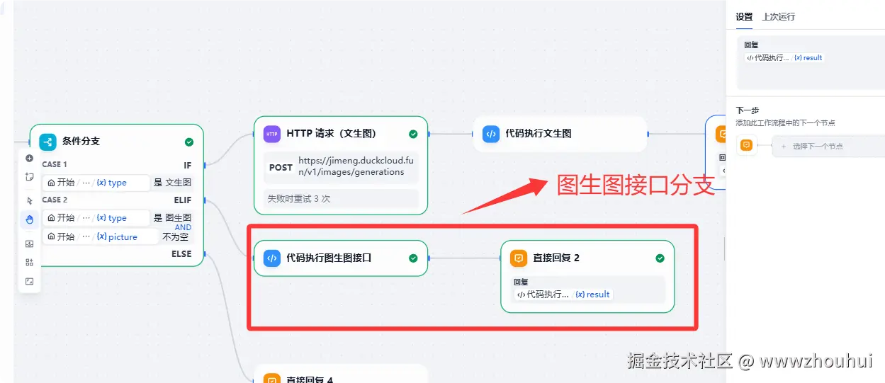 我们 在if条件分支判断了解,工作流还有另外一个分支,这个地方就是图生图,接口地址和处理方式有一点不一样我们这里就用代码调用方式。