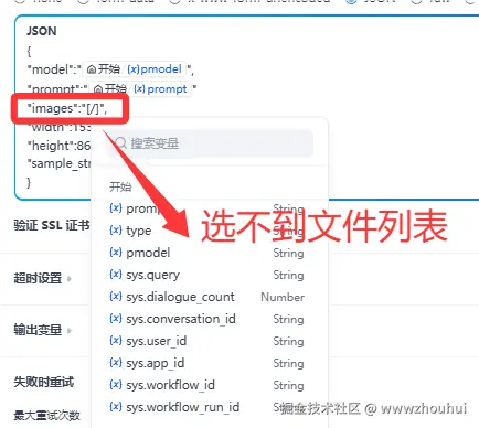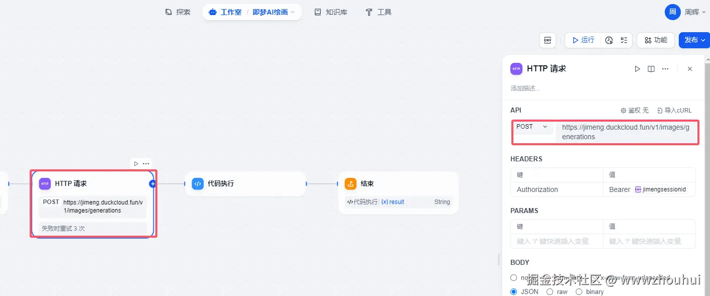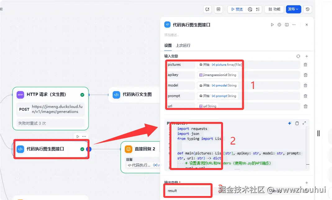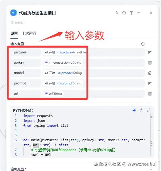 这个地方主要目的就是处理图生图接口调用以及数据返回。有的小伙伴可能会问,dify自带HTTP请求不是更简单,干嘛要自己写代码搞的这么复杂。这里解释一下,因为这个业务场景中会出现多个图上传功能。而http请求的body部分 不支持文件列表,没办法在http请求满足这个业务场景。
