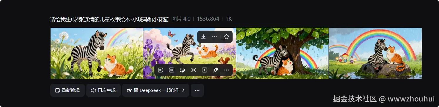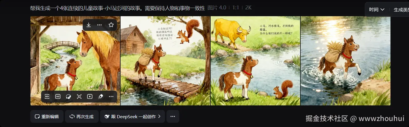 目前即梦4.0比较强大的地方在于能够生成一组一致性画面多个图。通过很简单的提示词就可以生成一组一致性的组图。这个确实比较强的。