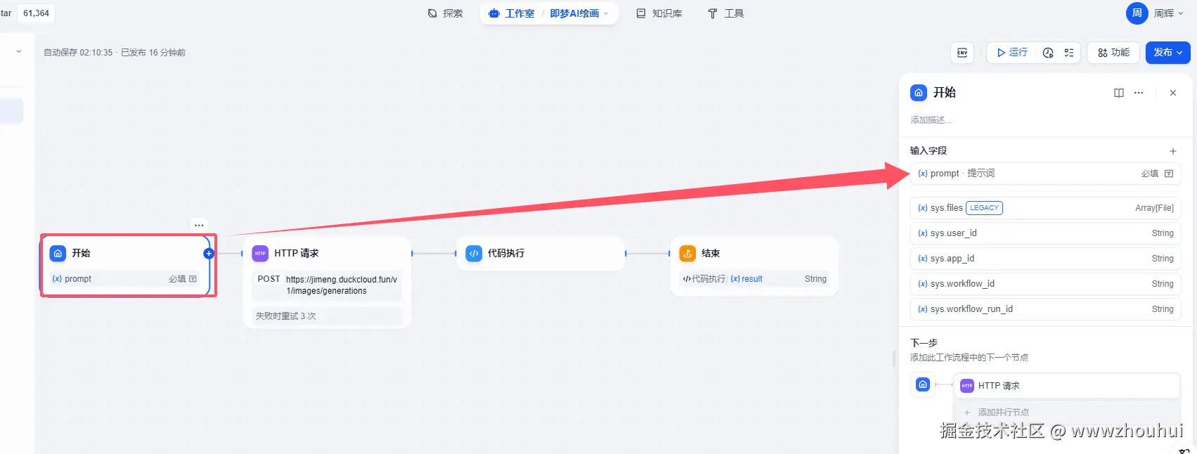 开始节点这地方设置比较简单,就是接受用户的提示词-prompt