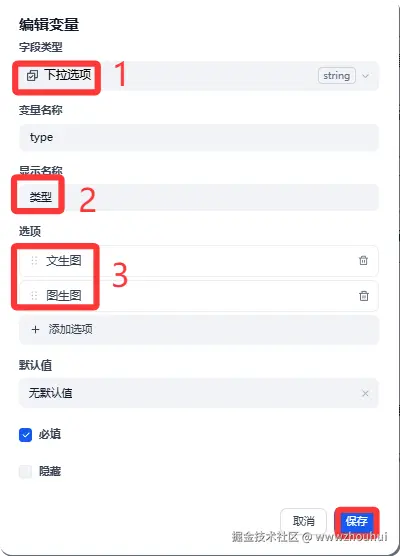 考虑到这个工作流支持文生图、文生视频,所以开始节点配置参数要比其他工作流多。主要是多了一下模型选择,type类型等。