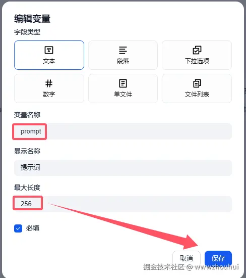 目前dify 文本输入地方最大长度是256,这里小伙伴要注意了,如果提示词过长会截断的。