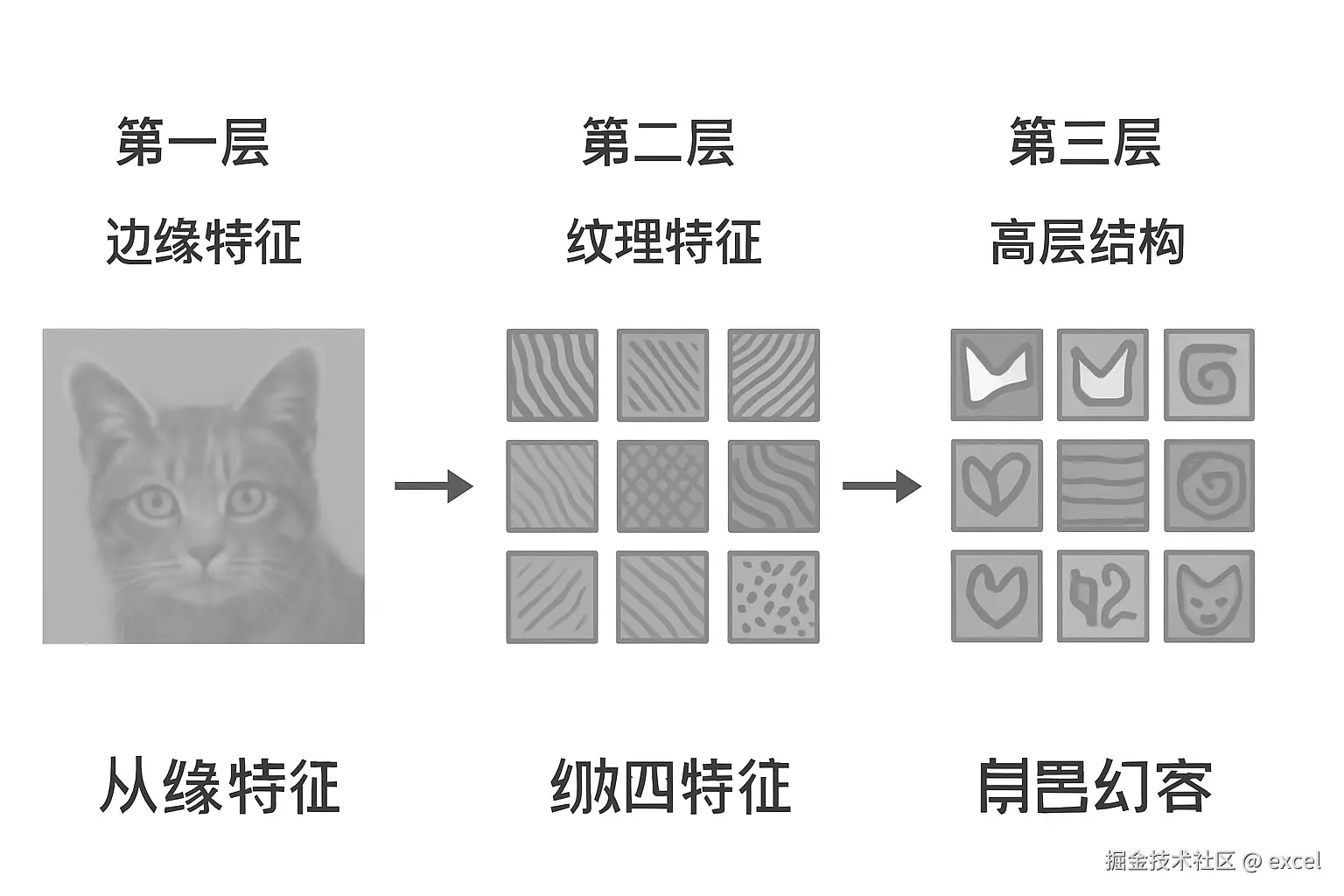 - 第三层:组合纹理形成猫脸 → 最终能够识别猫的整体结构。