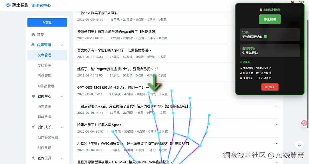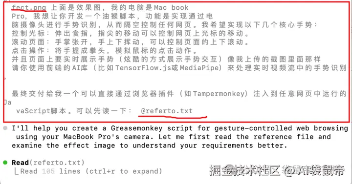 一个油猴插件,可以通过手势,隔空操纵网页。 之前试了不少其他AI编程工具都没搞定,基本上都是在绕圈子,疯狂改bug,一直改不好(其中也有搭配Claude模型的工具)。 我把效果截图给codebuddy code,同时把需求连同一些更细节的实现方案丢了过去。